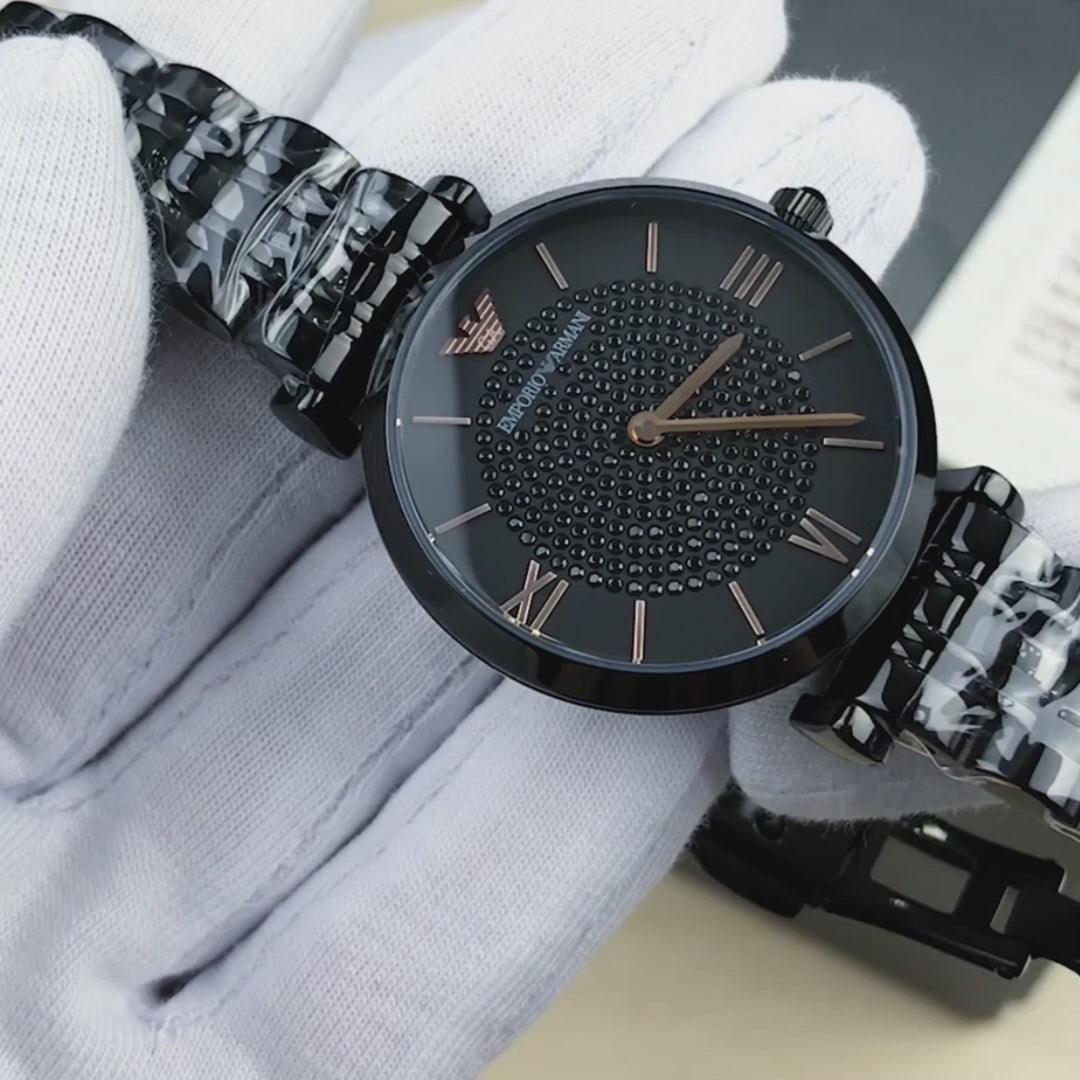 Elevate your style with the Emporio Armani AR11245 T-Bar Black Ladies Watch, featuring a captivating black design with rose gold-tone accents and pave crystal center for a touch of luxury.