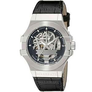 Shop the Maserati Potenza Men's Automatic Watch R8821108001 at Watch & Watch. Featuring a 42mm silver-tone stainless steel case, black leather strap, and bold black skeleton dial, this timepiece is powered by the TMI Caliber NH70 automatic movement with a 41-hour power reserve. Designed with luminous silver-tone hands, scratch-resistant mineral crystal, and 100 metres water resistance, it combines casual elegance with Maserati’s signature craftsmanship.