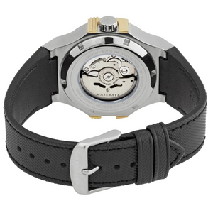 Discover the Maserati Potenza Men's Automatic Watch R8821108011 at Watch & Watch. Featuring a 42mm silver-tone stainless steel case, black leather strap, and a striking black dial with a silver skeleton center, this automatic timepiece showcases luminous yellow gold-tone hands and markers. Designed with a transparent case back, fixed yellow gold PVD bezel, and scratch-resistant mineral crystal, it offers 100 metres water resistance while blending refined elegance with sporty sophistication.