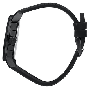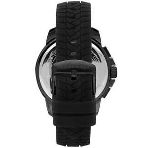 Maserati R8871621011 Men's Watch features a 44 mm black stainless steel case, black silicone strap, and black dial with quartz movement. Designed for durability and comfort, with 100M water resistance and a sporty edge—available now at Watch & Watch.